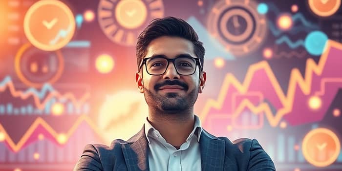 A vibrant photo-like illustration of a confident individual surrounded by glowing financial charts and swirling abstract shapes, symbolizing intuition and analytical insight guiding their decisions, bathed in warm, inspiring light.